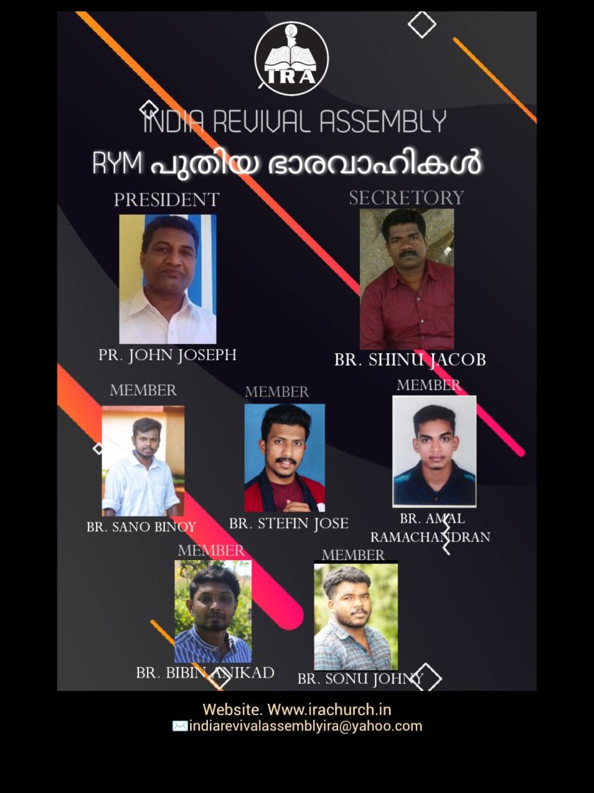 കോട്ടയം : കറുകച്ചാൽ ആസ്ഥാനമായി പ്രവർത്തിക്കുന്ന ഇന്ത്യാ റിവൈവൽ അസംബ്ലി ദൈവസഭയുടെ യുവജന വിഭാഗമായ റിവൈവൽ യൂത്ത്മൂവ്മെന്റിന് പുതിയ ഭാരവാഹികളെ തെരഞ്ഞെടുത്തു. പാസ്റ്റർ ജോൺ ജോസഫ് (പ്രസിഡന്റ്), ബ്രദർ ഷിനു ജേക്കബ് (സെക്രട്ടറി), സ്റ്റെഫിൻ ജോസ്, ബിബിൻ പി. ബാബു, അമൽ, സോനു ജോണി, സനോ ബിനോയ് (കമ്മിറ്റിയംഗങ്ങൾ) എന്നിവരാണ് ആർ.വൈ.എം. പുതിയ ഭാരവാഹികൾ. ജൂലൈ 23-ന് പാടിമൺ ഐ.ആർ.എ സഭാ ഹാളിൽ നടന്ന മാസയോഗത്തോടനുബന്ധിച്ച് പാസ്റ്റർ സാബു എം. ജോസഫിന്റെ അദ്ധ്യക്ഷതയിൽ ചേർന്ന പ്രത്യേക യോഗത്തിലാണ് ആർ.വൈ.എം-ന്റെ പുതിയ സാരഥികളെ തെരഞ്ഞെടുത്തത്.