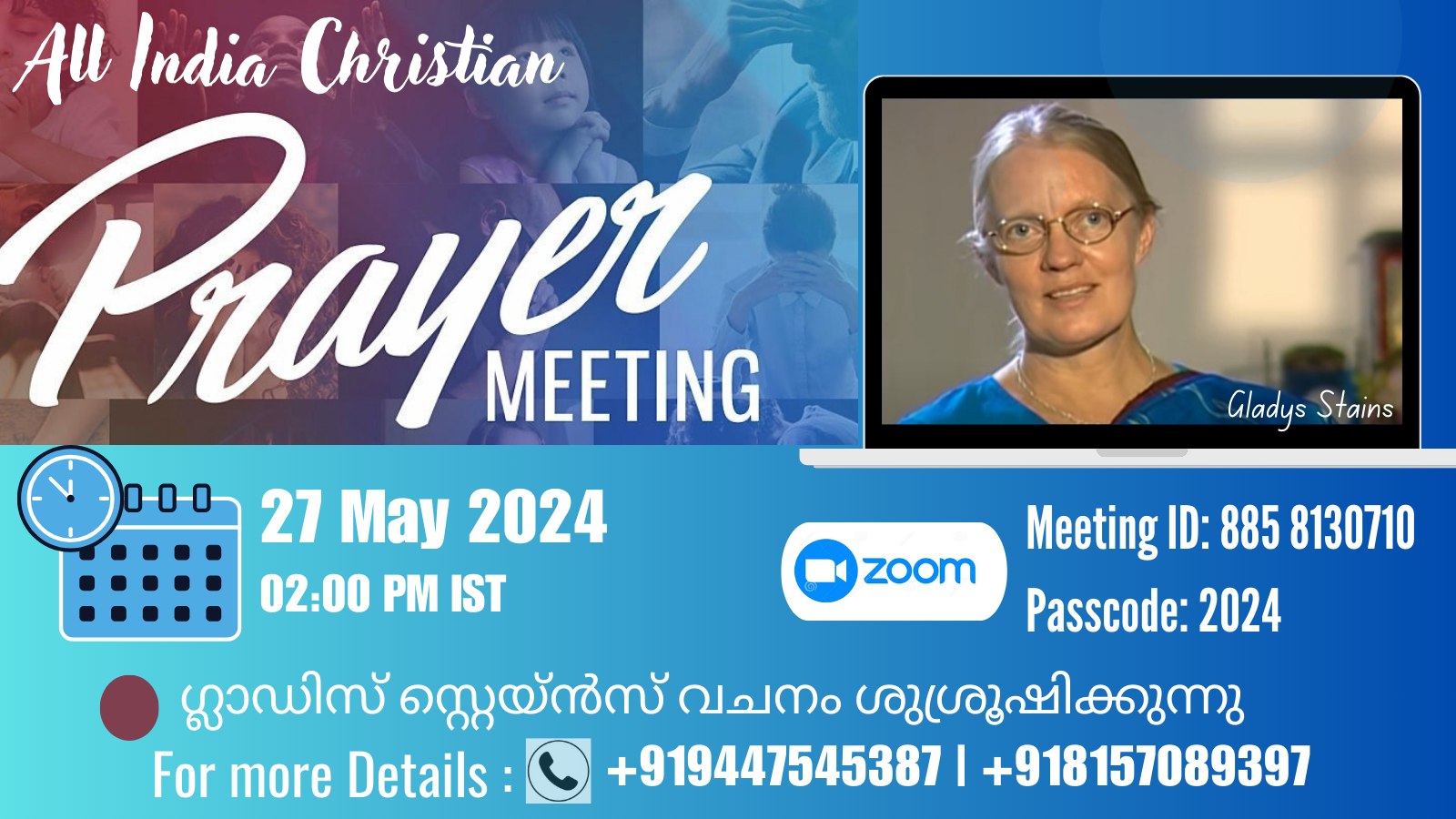 വയനാട് : സഭാ-സംഘടനാ വ്യത്യാസമില്ലാതെ ലീഡേഴ്സിനെയും സഭാ അംഗങ്ങളെയും പങ്കെടുപ്പിച്ചുകൊണ്ട് സൂം പ്ലാറ്റ് ഫോമിൽ നടക്കുന്ന ഓൾ ഇന്ത്യാ ക്രിസ്ത്യൻ പ്രെയർ മീറ്റിൽ സിസ്റ്റർ ഗ്ലാഡിസ് സ്റ്റെയിൻസ് പ്രസംഗിക്കും. 2024 മെയ് 27 തിങ്കളാഴ്ച ഇന്ത്യൻ സമയം ഉച്ചക്ക് 2 മണിക്കാണ് പ്രാർത്ഥനാ സമ്മേളനം. സുവി. എബിൻ അലക്സ് സംഗീത ശുശ്രൂക്ഷക്ക് നേതൃത്വം നൽകും. അതിഥി ഗായകരും ഗാനാലാപനം നടത്തും.