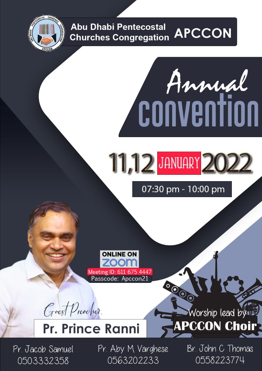 അബുദബി: പെന്തകോസ്തൽ ചർച്ചസ് കോൺഗ്രിഗഷൻ (APCCON) ന്റെ 2021- 22 വർഷത്തിലെ വാർഷിക കൺവെൻഷൻ ജനുവരി 11,12 (ചൊവ്വ, ബുധൻ ) തീയതികളിൽ യൂ.എ.ഇ സമയം 07:30 മുതൽ 09:30 വരെ സൂം പ്ലാറ്റഫോമിലൂടെ നടക്കും. പാസ്റ്റർ പ്രിൻസ് റാന്നി ദൈവ വചനത്തിൽ നിന്നും ശുശ്രുഷിക്കും. അപ്കോൺ കൊയർ ഗാനശുശ്രൂഷയ്ക്ക് നേതൃത്വം നൽകും. പാസ്റ്റർ ജേക്കബ് സാമുവേൽ, പാസ്റ്റർ എബി എം. വർഗീസ്, ബ്രദർ ജോൺസി കടമ്മനിട്ട തുടങ്ങിയവർ ക്രമീകരണങ്ങൾക്കു നേതൃത്വം നൽകും.