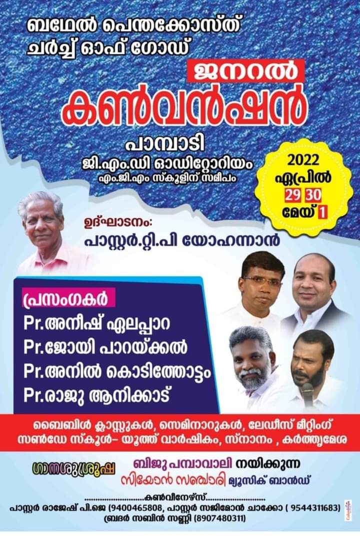 കോട്ടയം : ബെഥേൽ പെന്തക്കോസ്തു ചർച്ച് ഓഫ് ഗോഡ് ജനറൽ കൺവൻഷൻ ഏപ്രിൽ 29, 30, മെയ് 1 തീയതികളിൽ പാമ്പാടി ജി.എം.ഡി ഓഡിറ്റോറിയത്തിൽ (എം.ജി.എം സ്കൂളിനു സമീപം) നടക്കും. പാസ്റ്റർ റ്റി.പി.യോഹന്നാൻ കൺവൻഷൻ ഉദ്ഘാടനം ചെയ്യും. പാസ്റ്റർമാരായ അനീഷ് ഏലപ്പാറ, ജോയി പാറയ്ക്കൽ, രാജു ആനിക്കാട്, അനിൽ കൊടിത്തോട്ടം എന്നിവർ വചനം പ്രസംഗിക്കും. ബൈബിൾ ക്ലാസ്സ്, സെമിനാർ, ലേഡീസ് മീറ്റിംഗ്, സണ്ടേസ്കൂൾ-യൂത്ത് സമ്മേളനം, സ്നാനം, കർത്തൃമേശ എന്നിവയും കൺവൻഷനോടനുബന്ധിച്ചു നടക്കും. ബിജു പമ്പാവാലിയുടെ നേതൃത്വത്തിൽ ‘സീയോൻ സഞ്ചാരി മ്യൂസിക് ബാൻഡ്’ ഗാനശുശ്രൂഷ നയിക്കും. പാസ്റ്റർ രാജേഷ് പി.ജെ, പാസ്റ്റർ സജിമോൻ ചാക്കോ, ബ്രദർ സബിൻ സണ്ണി എന്നിവർ കൺവീനർമാരായി പ്രവർത്തിക്കുന്നു.