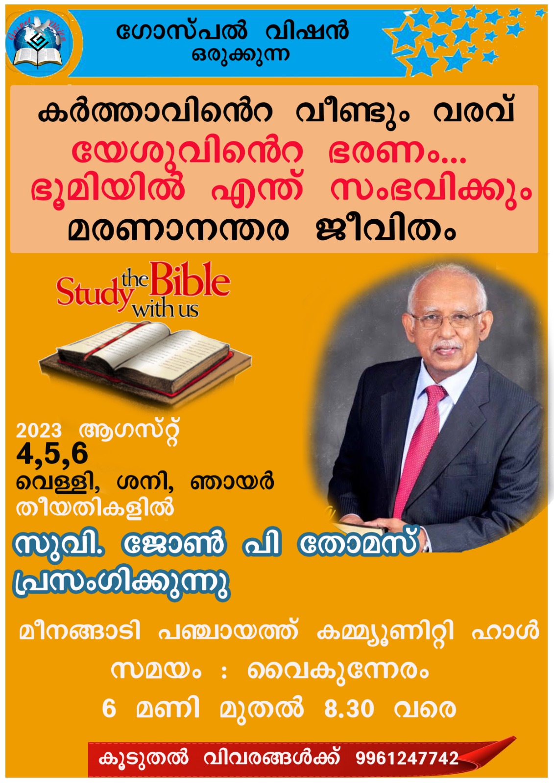 വയനാട്: ഗോസ്പൽ വിഷന്റെ ആഭിമുഖ്യത്തിൽ ഓഗസ്റ്റ് 4 മുതൽ 6 വരെ മീനങ്ങാടി പഞ്ചായത്ത് കമ്മ്യൂണിറ്റി ഹാളിൽ ബൈബിൾ കൺവൻഷൻ നടക്കും. സുവി. ജോൺ പി.തോമസ് പ്രസംഗിക്കും.