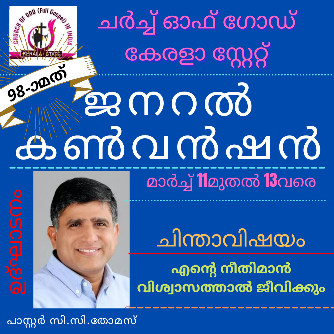 മുളക്കുഴ: ചർച്ച് ഓഫ് ഗോഡ് കേരളാ സ്റ്റേറ്റ് 98-ാമത് ജനറൽ കൺവൻഷൻ മാർച്ച് 11 മുതൽ 13 വരെ സഭാ ആസ്ഥാനമായ മുളക്കുഴ സീയോൻ കുന്നിൽ നടക്കും. സ്റ്റേറ്റ് ഓവർസീയർ റവ.സി.സി.തോമസ് കൺവൻഷൻ ഉദ്ഘാടനം ചെയ്യും. ‘എന്റെ നീതിമാൻ വിശ്വാസത്താൽ ജീവിക്കും’ എന്നതാണ് ഇത്തവണത്തെ ചിന്താവിഷയം. സഭയുടെ പ്രധാന ശുശ്രൂഷകർ വിവിധ സെഷനുകളിൽ പ്രസംഗിക്കും. ചർച്ച് ഓഫ് ഗോഡ് ക്വയർ ഗാന ശുശ്രൂഷ നയിക്കും. കോവിഡിന്റെ പശ്ചാത്തലത്തിൽ കൺവൻഷൻ സ്ഥലത്ത് എത്തുന്നവരുടെ എണ്ണം പരിമിതപ്പെടുത്തിയിട്ടുണ്ട്. അഡ്മിനിസ്ട്രേറ്റീവ് അസിസ്റ്റന്റ് പാസ്റ്റർ വൈ. റെജി, കൗൺസിൽ സെക്രട്ടറി പാസ്റ്റർ റ്റി.എം. മാമച്ചൻ, എജ്യുക്കേഷൻ ഡയറക്ടർ ഡോ.ഷിബു കെ.മാത്യു തുടങ്ങിയവർ നേതൃത്വം നൽകും. സൂം, ഫേസ്ബുക്ക്, യുട്യൂബ് തുടങ്ങിയ ഓൺലൈൻ മാധ്യമങ്ങളിലൂടെ കൺവൻഷന്റെ തത്സമയ സംപ്രേഷണം ഉണ്ടായിരിക്കുമെന്ന് മീഡിയ ഡയറക്ടർ പാസ്റ്റർ സാംകുട്ടി മാത്യു, സെക്രട്ടറി പാസ്റ്റർ ഷൈജു തോമസ് ഞാറയ്ക്കൽ എന്നിവർ അറിയിച്ചു.