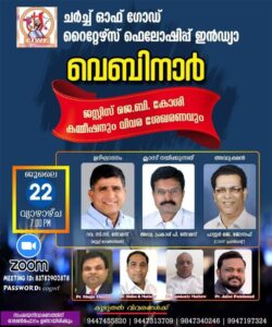 മുളക്കുഴ: ജസ്റ്റിസ് ജെ.ബി.കോശി കമ്മിഷൻ വിവര ശേഖരണവുമായി ബന്ധപ്പെട്ട് ചർച്ച് ഓഫ് ഗോഡ് റൈറ്റേഴ്സ് ഫെലോഷിപ്പ് ഇന്ത്യയുടെ ആഭിമുഖ്യത്തിൽ ജൂലൈ 22 വ്യാഴാഴ്ച പ്രത്യേക വെബിനാർ നടക്കും. പ്രസിഡന്റ് പാസ്റ്റർ ജെ.ജോസഫിന്റെ അദ്ധ്യക്ഷതയിൽ വൈകിട്ട് 7 മണിക്ക് സൂം പ്ലാറ്റ്ഫോമിൽ നടക്കുന്ന വെബിനാർ ദൈവസഭാ സ്റ്റേറ്റ് ഓവർസീയർ റവ.സി.സി.തോമസ് ഉദ്ഘാടനം ചെയ്യും. ന്യൂനപക്ഷ കാര്യ വിദഗ്ധനും പ്രമുഖ അഭിഭാഷകനുമായ അഡ്വ. പ്രകാശ് പി.തോമസ് ക്ലാസ്സെടുക്കും. വിഷയം: ‘ജസ്റ്റിസ് ജെ.ബി.കോശി കമ്മിഷനും ക്രിസ്ത്യൻ ന്യൂനപക്ഷ വിവര ശേഖരണവും’. വിവര ശേഖരണം സംബ്ബന്ധിച്ച സംശയങ്ങൾ ദുരീകരിക്കുന്നതിന് പൊതു ചർച്ചയും ഉണ്ടായിരിക്കുന്നതാണ്. കമ്മിഷന്റെ പഠന ഉപസമിതി അംഗങ്ങൾ പങ്കെടുക്കും. പാസ്റ്റർമാരായ ഡോ.ഷിബു കെ.മാത്യു, ജെയ്സ് പാണ്ടനാട്, ഷൈജു തോമസ്, സാംകുട്ടി മാത്യു, ഷാജി ഇടുക്കി, ബിജു ജോയി, ബ്രദർ അജി കുളങ്ങര തുടങ്ങിയവർ നേതൃത്വം നൽകും.