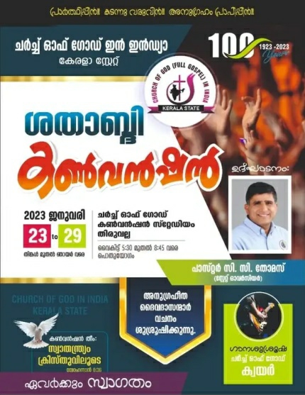 തിരുവല്ല: ഇന്നു മുതൽ ജനുവരി 29 വരെ നടക്കുന്ന ചർച്ച് ഓഫ് ഗോഡ് കേരള സ്റ്റേറ്റ് 100-ാമത് ജനറൽ കൺവൻഷൻ ഇന്നു വൈകുന്നേരത്തോടെ ആരംഭിക്കും. തിരുവല്ല രാമൻചിറ ദൈവസഭാ സ്റ്റേഡിയത്തിൽ നടക്കുന്ന സ്റ്റേറ്റ് കൺവൻഷൻ ഓവർസീയർ പാസ്റ്റർ സി.സി തോമസ് ഉദ്ഘാടനം ചെയ്യും.‘സ്വാതന്ത്ര്യം ക്രിസ്തുവിലൂടെ’ എന്നതാണ് ചിന്താവിഷയം. ശുശ്രൂഷക സമ്മേളനം, പവർ കോൺഫറൻസ്, സഹോദരി സമ്മേളനം, മിഷനറി സമ്മേളനം, വേദപാഠശാലകളുടെ ബിരുദ ദാന സമ്മേളനം, വിവിധ ബോർഡുകളുടെ സംയുക്ത സമ്മേളനം, ഉണർവ് യോഗം, സൺഡേസ്കൂൾ യുവജന സമ്മേളനം എന്നിവ നടക്കും. എല്ലാ ദിവസവും വൈകിട്ട് 5.30 മുതൽ 8.45 വരെയാണ് പൊതു സമ്മേളനങ്ങൾ. 29ന് രാവിലെ 8ന് നടക്കുന്ന സംയുക്ത സഭായോഗത്തോടെ സമാപിക്കും. കൺവൻഷന്റെ വിജയകരമായ നടത്തിപ്പിനായി പാസ്റ്റർ സി.സി തോമസ് ജനറൽ കൺവീനറായും, പാസ്റ്റർമാരായ വൈ. റെജി, ഷിബു .കെ മാത്യു, സജി ജോർജ് എന്നീവർ ജോയിന്റ് ജനറൽ കൺവീനർമാരായും വിവിധ കമ്മിറ്റികൾ പ്രവർത്തിക്കുന്നു. സഭയുടെ ജനറൽ കൺവൻഷൻ 1923-ൽ പമ്പാനദിയുടെ മണൽപ്പുറത്ത് ആറാട്ടുപുഴയിൽ അമേരിക്കൻ മിഷനറി റവ. റോബർട്ട് ഫെലിക്സ് കുക്കാണ് ആരംഭം കുറിച്ചത്. രണ്ടായിരത്തോളം സഭകളാണ് ചർച്ച് ഓഫ് ഗോഡിന് കേരളത്തിലുള്ളത്. ശതാബ്ദി കൺവൻഷനോട് അനുബന്ധമായി ജീവ കാരുണ്യ പ്രവർത്തനവും സഭയുടെ മൊത്തത്തിലുള്ള പുരോഗതിയും ലക്ഷ്യമാക്കി ഒരു വർഷമായി ആവിഷ്കരിച്ച് നടപ്പിലാക്കി വരുന്ന കർമ പദ്ധതികൾ പൂർത്തിയായി വരികയാണെന്ന് മീഡിയ ഡയറക്ടർ പാസ്റ്റർ സാംകുട്ടി മാത്യു, മീഡിയ കൺവീനർ പാസ്റ്റർ ഷൈജു തോമസ് ഞാറയ്ക്കൽ, ബിലീവേഴ്സ് ബോർഡ് സെക്രട്ടറി ജോസഫ് മറ്റത്തുകാല എന്നിവർ അറിയിച്ചു.