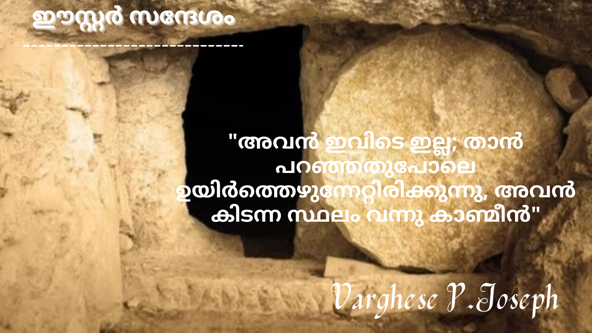 മരണത്തെ ഭയപ്പെടേണ്ടതില്ല, നിത്യതയിലേക്കുള്ള പ്രവേശന കവാടം മാത്രമാണ് മരണം എന്ന യാഥാർത്ഥ്യം കൂടി വെളിപ്പെടുത്തുന്നതാണ് ക്രിസ്തുവിന്റെ ഉത്ഥാനം. യേശുവിനെ അടക്കിയ കല്ലറയ്ക്ക് പട്ടാള കാവൽ ഉറപ്പാക്കി റോമൻ ഗവൺമെന്റ് അതിന്മേൽ പതിച്ച രാജകീയ മുദ്ര, ചിലന്തിവല പൊട്ടിച്ചു മാറ്റുന്നതിനെക്കാൾ എളുപ്പത്തിൽ അതിനെ ഭേദിച്ച് യേശു ഉയിർത്തെഴുന്നേറ്റു. അതിന് തെളിവായി യെരുശലേമിൽ ഇന്നും തുറന്നു കിടക്കുന്ന യേശുവിന്റെ കല്ലറ സന്ദർശിക്കുന്നവരുടെ കാതുകളിൽ പ്രതിധ്വനിക്കപ്പെടുന്ന ശബ്ദം രണ്ടായിരത്തിൽപ്പരം വർഷങ്ങൾക്കു മുമ്പ്, ദൂതൻ സ്ത്രീകളോട് അറിയിച്ച വിളംബരത്തിന്റെ ശബ്ദമാണ്. “അവൻ ഇവിടെ ഇല്ല; താൻ പറഞ്ഞതുപോലെ ഉയിർത്തെഴുന്നേറ്റിരിക്കുന്നു, അവൻ കിടന്ന സ്ഥലം വന്നു കാണ്മീൻ” (മത്താ.28:5,6).