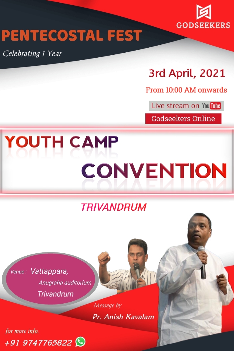 തിരുവനന്തപുരം: ‘ഗോഡ് സീക്കേഴ്സ്’ എന്ന വാട്സ്ആപ് ഗ്രൂപ്പിന്റെ ആഭിമുഖ്യത്തിൽ പെന്തക്കോസ്തൽ യൂത്ത് ക്യാമ്പും യൂത്ത് ഫെസ്റ്റും ഏപ്രിൽ 3-ന് തിരുവനന്തപുരം വട്ടപ്പാറ അനുഗ്രഹ ഓഡിറ്റോറിയത്തിൽ നടക്കും. ‘ഗോഡ് സീക്കേഴ്സ്’ വാട്സ്ആപ് ഗ്രൂപ്പിന്റെ ഒന്നാം വാർഷികത്തോടനുബന്ധിച്ചാണ് ക്യാമ്പ്. രാവിലെ 10 മുതൽ 1മണി വരെ നടക്കുന്ന ക്യാമ്പിൽ ഇവാ. സൈലസ് കെ. ദേവസ്യ ശുശ്രൂഷിക്കും. ഗെയിമുകൾ, പപ്പറ്റ് ഷോ, മറ്റ് വിവിധ പ്രോഗ്രാമുകൾ എന്നിവ ഉണ്ടായിരിക്കും. വൈകിട്ട് 6 മണിക്ക് നടക്കുന്ന കൺവെൻഷനിൽ പാസ്റ്റർ അനീഷ് കാവാലം പ്രസംഗിക്കും.