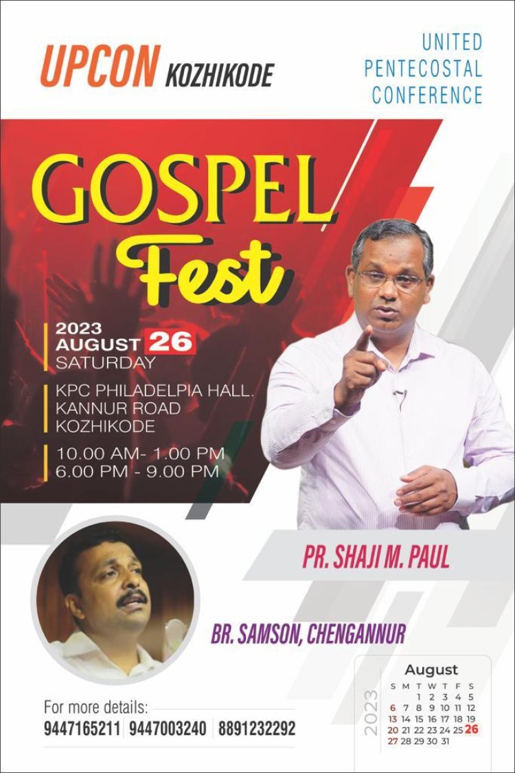കോഴിക്കോട് : കോഴിക്കോടുള്ള പാസ്റ്റർമാരുടെ കൂട്ടായ്മയായ യുണൈറ്റഡ് പെന്തക്കോസ്റ്റൽ കോൺഫറൻസ് നേതൃത്വം നൽകുന്ന ഗോസ്പെൽ ഫെസ്റ്റ് 2023 ആഗസ്റ്റ് 26 ന് കോഴിക്കോട് കണ്ണൂർ റോഡിലെ കെ പി സി ഫിലദൽഫ്യ സഭാ ഹാളിൽ നടക്കും. രാവിലെ 10 മണിക്കും വൈകുന്നേരം 6 മണിക്കും നടക്കുന്ന ആത്മീയ സമ്മേളനത്തിൽ സുവിശേഷ പ്രഭാഷകൻ പാസ്റ്റർ ഷാജി എം. പോൾ പ്രസംഗിക്കും. സാംസൺ ചെങ്ങന്നൂരിന്റെ നേതൃത്വത്തിൽ സംഗീത ശുശ്രുഷ നടക്കും. പാസ്റ്റർമാരായ കെ.സി. സണ്ണി, നോബിൾ പി. തോമസ് എന്നിവർ നേതൃത്വം നൽകും.
