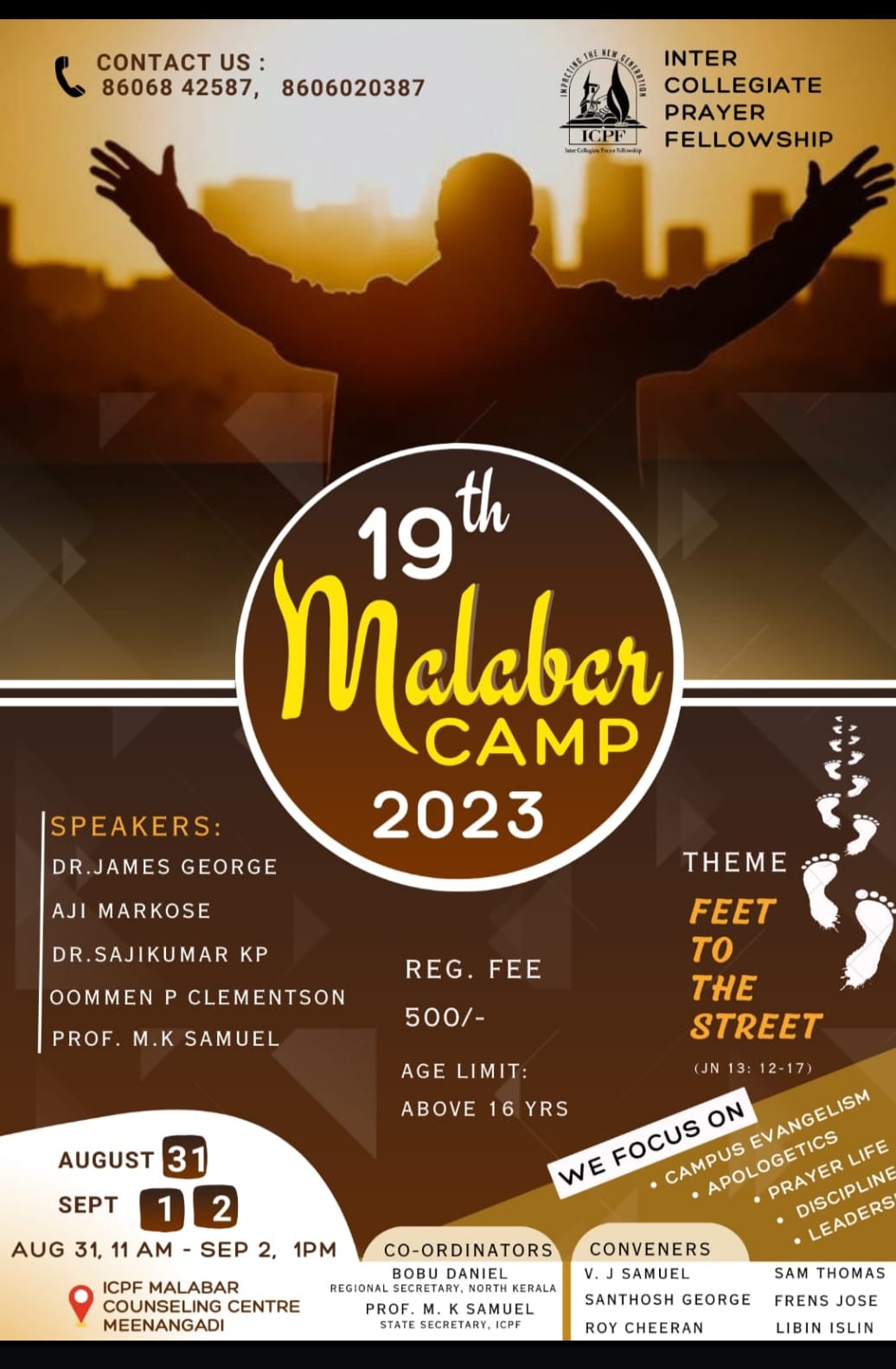 “പാദങ്ങൾ തെരുവിലേക്ക് ” എന്നതാണ് ക്യാമ്പ് തീം. ഐ.സി.പി.എഫ് ക്വയർ ഗാനശുശ്രുഷക്ക് നേതൃത്വം നൽകും.
