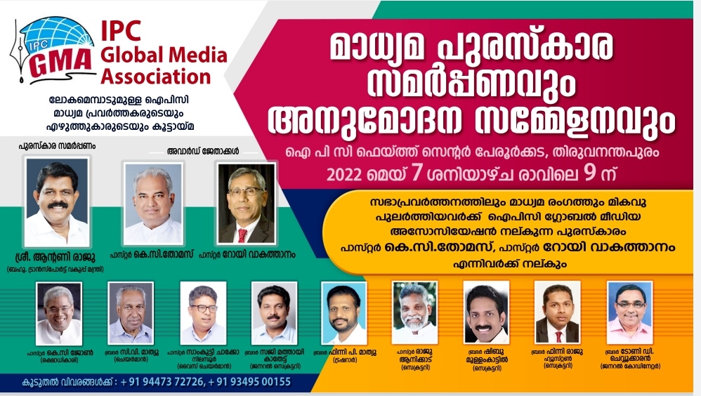 തിരുവല്ല: ഐപിസി ഗ്ലോബൽ മീഡിയ അസോസിയേഷൻ മാധ്യമ പുരസ്കാര സമർപ്പണം ഇന്നു രാവിലെ 9 മണിക്ക് തിരുവനന്തപുരം പേരൂർക്കട ഐ പി സി ഫെയ്ത് സെന്ററിൽ നടക്കും. അവാർഡ് ജേതാക്കളായ പാസ്റ്റർ കെ.സി. തോമസ്, പാസ്റ്റർ റോയി വാകത്താനം എന്നിവർക്ക് മന്ത്രി ആന്റണി രാജു പുരസ്കാരം നൽകും. ക്രൈസ്തവ രംഗത്തെ സമഗ്ര സംഭാവനയ്ക്കുള്ള പുരസ്കാരമാണിത്. സമ്മേളനത്തിൽ പാസ്റ്റർ കെ.സി.തോമസിന്റെ 50-ാമത്തെ പുസ്തകമായ ‘ക്രിസ്തുവിന്റെ ഡ്യൂലോസ്’ എന്ന ആത്മകഥയും പ്രകാശനം ചെയ്യും. അഞ്ചു പതിറ്റാണ്ടു കാലമായി പ്രേഷിത രംഗത്തും സഭാ പ്രവർത്തനത്തിലും എഴുത്തു മേഖലയിലും നിറസാന്നിദ്ധ്യമായ പാസ്റ്റർ കെ.സി.തോമസ് കോവിഡ് കാലത്ത് 25 പുസ്തകൾ എഴുതി പ്രസിദ്ധീകരിച്ചു. ഐപിസി മുൻ സംസ്ഥാന പ്രസിഡന്റും തിരുവനന്തപുരം വെസ്റ്റ് സെന്റർ ശുശ്രൂഷകനും കൺവൻഷൻ പ്രസംഗകനുമാണ് അദ്ദേഹം. മികച്ച വേദാദ്ധ്യാപകനും നിരവധി പുസ്തകങ്ങളുടെ രചയിതാവുമായ പാസ്റ്റർ റോയി വാകത്താനം സുവിശേഷ രംഗത്തും ജീവകാരുണ്യ മേഖലയിലും സംഘാടനത്തിലും ശ്രദ്ധേയനാണ്.