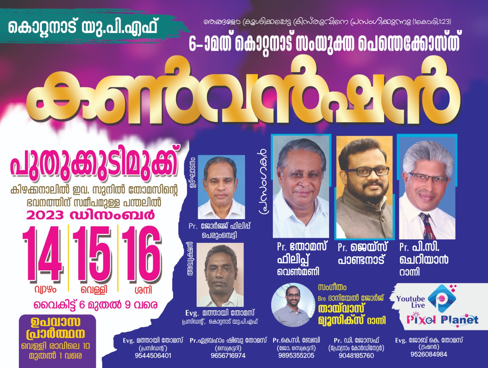 റാന്നി: ആറാമത് കൊറ്റനാട് ഐക്യ പെന്തക്കോസ്ത് കൺവൻഷൻ ഡിസംബർ 14, 15, 16 തീയതികളിൽ പുതുക്കുടി മുക്കിൽ നടക്കും. പാസ്റ്റർ ജോർജജ് ഫിലിപ്പ് പെരുംമ്പെട്ടി ഉത്ഘാടനം ചെയ്യും. യു.പി.എഫ് പ്രസിഡന്റ് ഇവാ. മത്തായി തോമസ് അധ്യക്ഷത വഹിക്കും. പാസ്റ്റർ തോമസ് ഫിലിപ്പ് വെൺമണി, പാസ്റ്റർ ജെയ്സ് പാണ്ടനാട്, പാസ്റ്റർ പി.സി ചെറിയാൻ റാന്നി എന്നിവർ പ്രസംഗിക്കും. തായ്‌വാസ് മ്യൂസിക്സ് റാന്നി ഗാനശുശ്രൂഷ നിർവ്വഹിക്കും. പാസ്റ്റർ ഏബ്രഹാം ഷിബു തോമസ്, പാസ്റ്റർ കെ.സി. ബേബി, പാസ്റ്റർ ഡി. ജോസഫ്, ഇവ. ജോബ് കെ. തോമസ് എന്നിവർ നേതൃത്വം നൽകും.