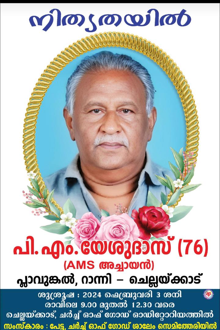 കറുകച്ചാൽ: കർത്തൃസന്നിധിയിൽ ചേർക്കപ്പെട്ട ചമ്പക്കര പ്ലാവുങ്കൽ പി.എം. യേശുദാസിന്റെ (76) സംസ്ക്കാരം ഇന്ന് രാവിലെ 9 മണിക്ക് റാന്നി ചെല്ലക്കാട് ചർച്ച് ഓഫ് ഗോഡ് സഭാ ഹാളിലെ ശുശ്രൂഷകൾക്കു ശേഷം 12.30-ന് പേട്ട ചർച്ച് ഓഫ് ഗോഡ് ശാലേം സെമിത്തേരിയിൽ നടക്കും.