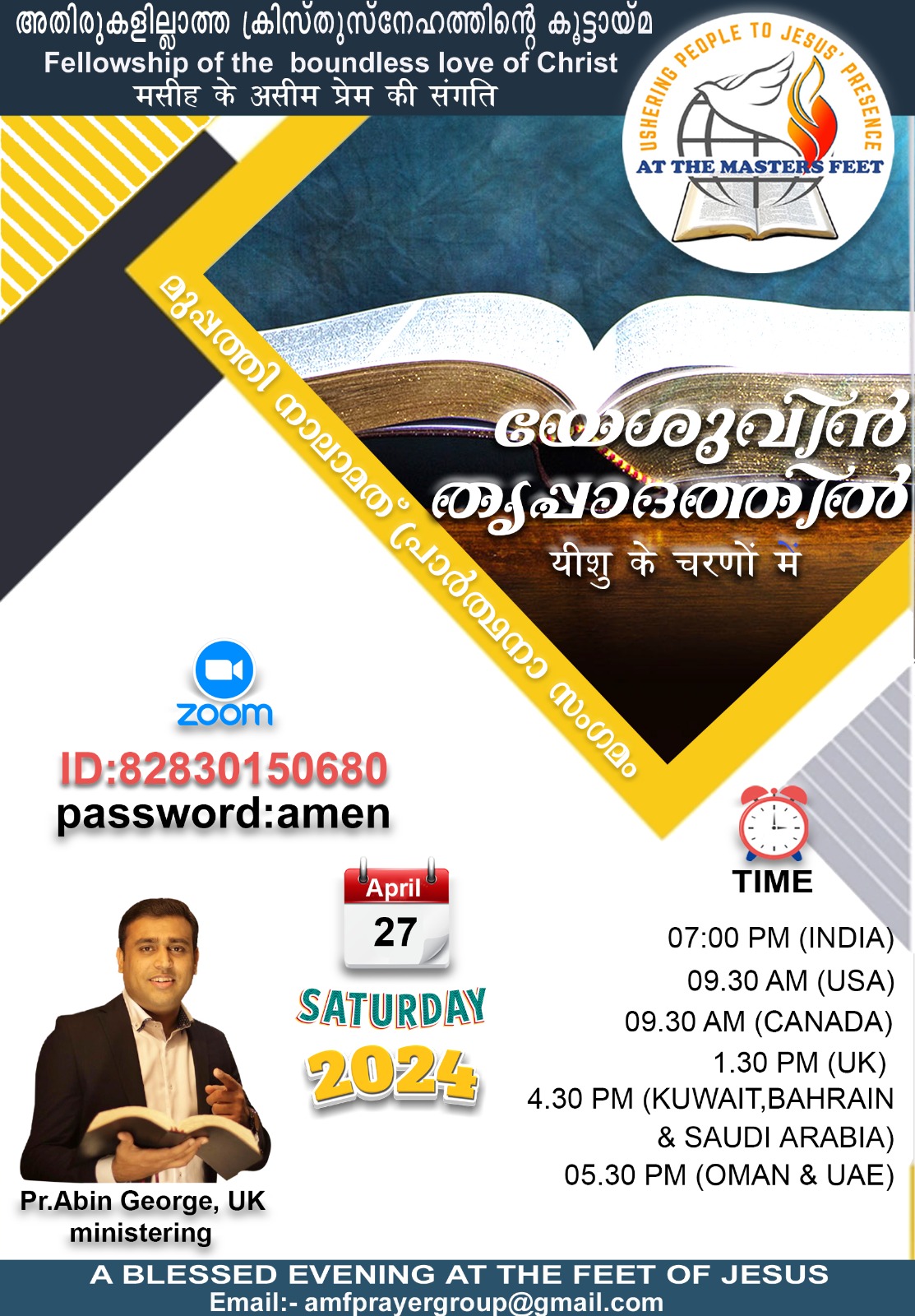 ഒമാൻ: അതിരുകളില്ലാത്ത ദൈവവചനത്തിലൂടെ ദൈവസ്നേഹം എല്ലാവരിലേക്കും എത്തിക്കുക എന്ന ലക്ഷ്യത്തോടെ ‘യേശുവിൻ തൃപ്പാദത്തിൽ’ 34-ാമത് പ്രാർത്ഥനാ സംഗമം ഇന്ന് രാത്രി 7.00-ന് ഓൺലൈനിൽ നടക്കും. പാസ്റ്റർ എബിൻ ജോർജ് (യു.കെ) വചനം ശുശ്രൂഷിക്കും. കൂടാതെ അനുഗ്രഹീത ക്രൈസ്തവ ഗായകൻ ബ്രദർ ഫിന്നി സാമുവെൽ& ടീം (മസ്കറ്റ്) നയിക്കുന്ന ഗാന ശുശ്രൂഷയും ഉണ്ടായിരിക്കും.