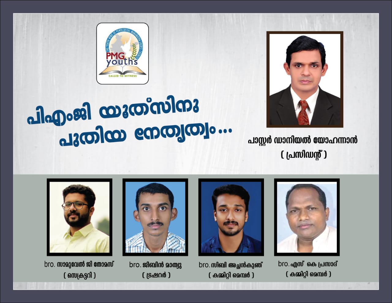 തിരുവനന്തപുരം: പെന്തക്കോസ്തു മാറാനാഥാ ഗോസ്പൽ ചർച്ച് യുവജന വിഭാഗമായ പി.എം.ജി.യൂത്ത്സിന്റെ പുതിയ ഭാരവാഹികളെ തെരഞ്ഞെടുത്തു. പാസ്റ്റർ ദാനിയേൽ യോഹന്നാൻ (പ്രസിഡന്റ്), ബ്രദർ സാമുവേൽ ജി.തോമസ് (സെക്രട്ടറി), ബ്രദർ ജിബിൻ മാത്യു (ട്രഷറർ), സിബി അച്ചൻ കുഞ്ഞ്, പാസ്റ്റർ എസ്.കെ. പ്രസാദ് (മെമ്പേഴ്സ്) എന്നിവരാണ് പി.എം.ജി യൂത്ത്സ് പുതിയ സ്റ്റേറ്റ് കമ്മിറ്റി ഭാരവാഹികൾ. ജനുവരി 26-ന് ചേർന്ന ജനറൽ ബോഡി യോഗത്തിലാണ് തെരഞ്ഞെടുപ്പ് നടന്നത്.