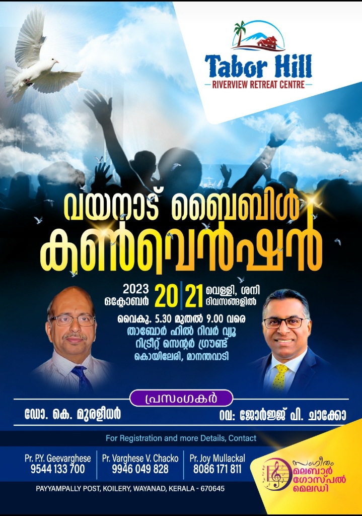 വയനാട് : പവ്വർ കോൺഫറൻസും സായാഹ്ന കൺവെൻഷനും ഒക്ടോബർ 20, 21 തീയതികളിൽ കൊയിലേരി താബോർഹിൽ റിവർവ്യു റിട്രീറ്റ് സെന്ററിൽ നടക്കും.