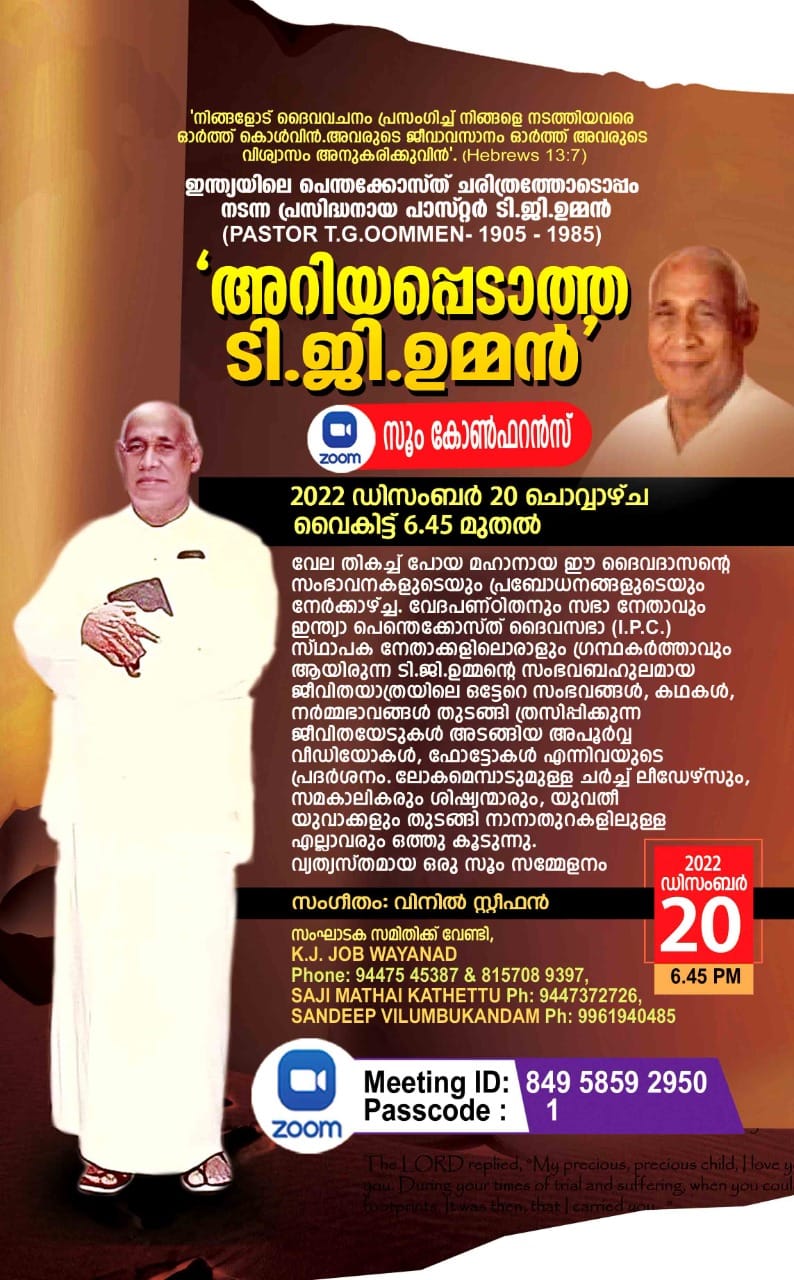 പ്രഥമ പ്രോഗ്രാമായി പാസ്റ്റർ ടി.ജി. ഉമ്മൻ്റെ (PASTOR T.G.OOMMEN-1905 -1985) ചരിത്രത്തിലേക്ക് ഒരു യാത്ര എന്ന നിലയിൽ  ‘അറിയപ്പെടാത്ത ടി. ജി. ഉമ്മൻ’ എന്ന നാമകരണത്തിൽ ഒരു സൂം കോൺഫറൻസ്  നാളെ (ഡിസംബർ 20  ചൊവ്വ) വൈകിട്ട് 6.45 മുതൽ നടക്കുന്നു. വിനിൽ സ്റ്റീഫൻ ഗാനങ്ങൾ ആലപിക്കും.