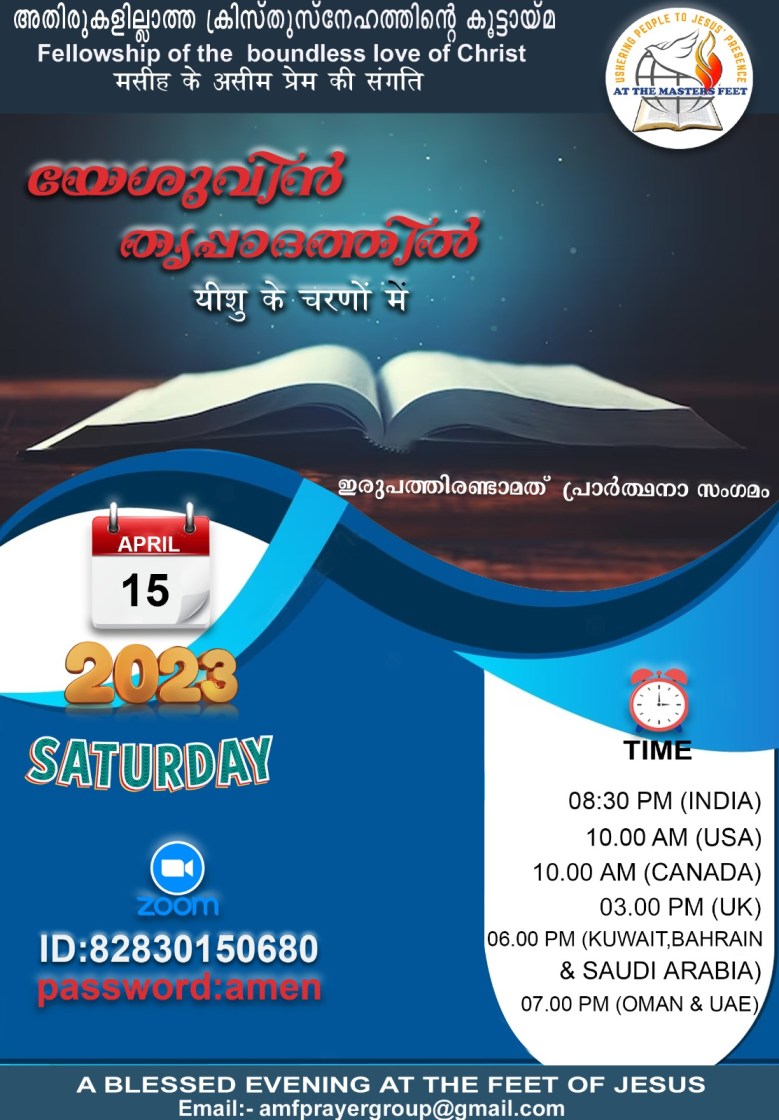 അതിരുകളില്ലാത്ത ദൈവവചനത്തിലൂടെ ദൈവസ്നേഹം എല്ലാവരിലേക്കും എത്തിക്കുക എന്ന ലക്ഷ്യത്തോടെ യേശുവിൻ തൃപ്പാദത്തിൽ 22-ാമത് പ്രാർത്ഥനാ സംഗമം ഏപ്രിൽ 15 ശനിയാഴ്ച ഇന്ത്യൻ സമയം രാത്രി 8.30-ന് ഓണലൈനിൽ നടക്കും. പാസ്റ്റർ ശശിധരൻ പോൾ (കുമ്പനാട്) മുഖ്യ സന്ദേശം നൽകും. കൂടാതെ അനുഗ്രഹീതരായ ദൈവദാസന്മാരുടെ സന്ദേശങ്ങളും ഗാനശുശ്രൂഷയും ഉണ്ടായിരിക്കും.