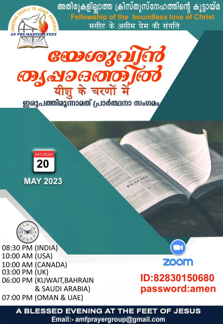 ഒമാൻ: ദൈവചനത്തിലൂടെ ദൈവ സ്നേഹം എല്ലാവരിലേക്കും എത്തിക്കുക എന്ന ലക്ഷ്യത്തോടെ ‘യേശുവിൻ തൃപ്പാദത്തിൽ’ 23-ാമത് പ്രാർത്ഥനാ സംഗമം 2023 മെയ് 20 ശനിയാഴ്ച ഇന്ത്യൻ സമയം രാത്രി 8.30-ന് ഓൺലൈനിൽ നടക്കും. പാസ്റ്റർ സ്റ്റാൻലി സഖറിയ (മുംബൈ) മുഖ്യ സന്ദേശം നൽകും. കൂടാതെ അനുഗ്രഹീതരായ ദൈവദാസന്മാരുടെ സന്ദേശങ്ങളും ഗാനശുശ്രൂഷയും ഉണ്ടായിരിക്കും.