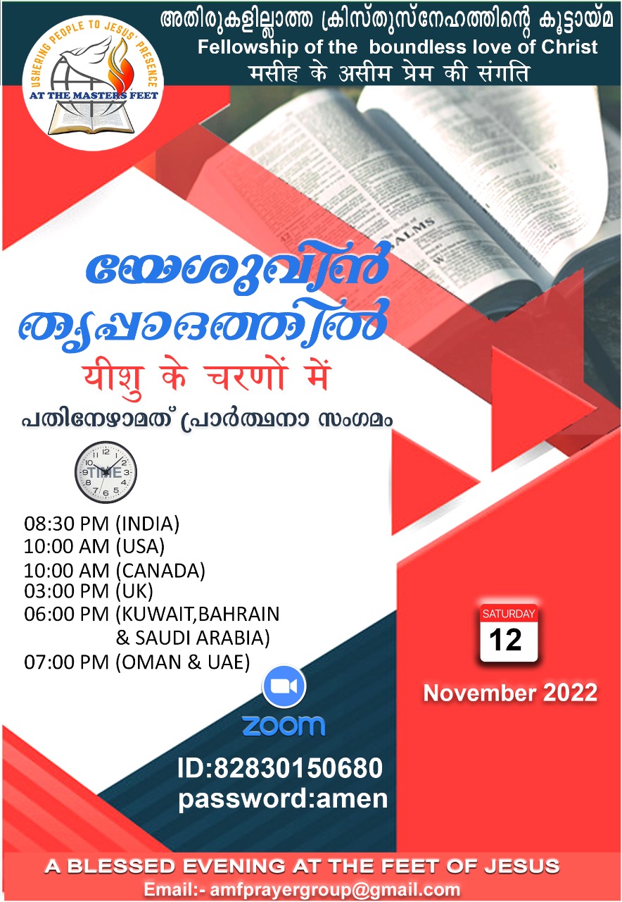 മസ്ക്കറ്റ്: അതിരുകളില്ലാത്ത ദൈവവചനത്തിലൂടെ ദൈവസ്‌നേഹം അതിർ വരമ്പുകളില്ലാതെ എല്ലാവരിലേക്കും എത്തിക്കുക എന്ന ലക്ഷ്യത്തോടെ യേശുവിൻ തൃപ്പാദത്തിൽ 17-ാമത് പ്രാർത്ഥനാ സംഗമം നവംബർ 12 ശനിയാഴ്ച ഇന്ത്യൻ സമയം രാത്രി 8.30-ന് ഓൺലൈനിൽ നടക്കും. പാസ്റ്റർ സുനിൽ എം. എബ്രഹാം (ബിലാസ്പൂര്‍) മുഖ്യ സന്ദേശം നൽകും. കൂടാതെ അനുഗ്രഹീതരായ ദൈവദാസന്മാരുടെ സന്ദേശങ്ങളും ഗാനശുശ്രൂഷയും ഉണ്ടായിരിക്കും. കോവിഡിന്റെ പിടിയിൽ ലോകം അമർന്നപ്പോൾ അനേകരുടെ ജീവനും ഉപജീവനോപാധികളും നഷ്ടമായപ്പോൾ, സ്വസ്ഥത നഷ്ടപ്പെട്ട ജീവിതങ്ങൾക്ക് നിസ്തുല സമാധാനത്തിന്റെ ഉറവിടവും, സമാധാന പ്രഭുവുമായ യേശുക്രിസ്തുവിനെ, ഏതെങ്കിലുമൊരു സഭാ വിഭാഗത്തിന്റെയോ സംഘടനയുടെയോ അതിർ വരമ്പുകളില്ലാതെ പരിചയപ്പെടുത്തുവാനായി ലോകത്തിന്റെ വിവിധ കോണുകളിൽ ഉപജീവനാർത്ഥം പാർക്കുന്ന ഏതാനും സഹോദരങ്ങൾ ചേർന്ന് തുടക്കമിട്ട കൂട്ടായ്മയാണ് ‘യേശുവിൻ തൃപ്പാദത്തിൽ’. 2021 ജൂലൈ മുതൽ സൂം മീഡിയയിലൂടെ ലോകമെമ്പാടുമുള്ള മലയാളികൾ ക്രിസ്തുവിനെ അറിയുവാൻ  ഒരു മുഖാന്തിരമായി ഇതിന്റെ പ്രവർത്തനങ്ങൾ നടന്നു വരുന്നു.
