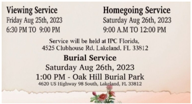തിരുവനന്തപുരം: ഫുൾ ഗോസ്പൽ ഇന്ത്യാ ചർച്ച് സ്ഥാപക പ്രസിഡന്റ് പരേതനായ പാസ്റ്റർ കെ.എം നൈനാന്റെ ഭാര്യ അന്നമ്മ നൈനാൻ (90) കർത്താവിൽ നിദ്ര പ്രാപിച്ചു. സംസ്കാര ശുശ്രൂഷ ഓഗസ്റ്റ് 26നു രാവിലെ 9.00 മുതൽ ഐപിസി ഫ്ലോറിഡ 4525 ക്ലബ്ബ് ഹൌസ് റോഡ്, ലേക്ക്ലാന്റ് FL 33812 ലെ ശുശ്രൂയ്ക്കു ശേഷം 1.00pm ന് Oak Hill Burial Park, 4620 US highway 98 South, Lakeland, FL-33812 ൽ നടക്കും.