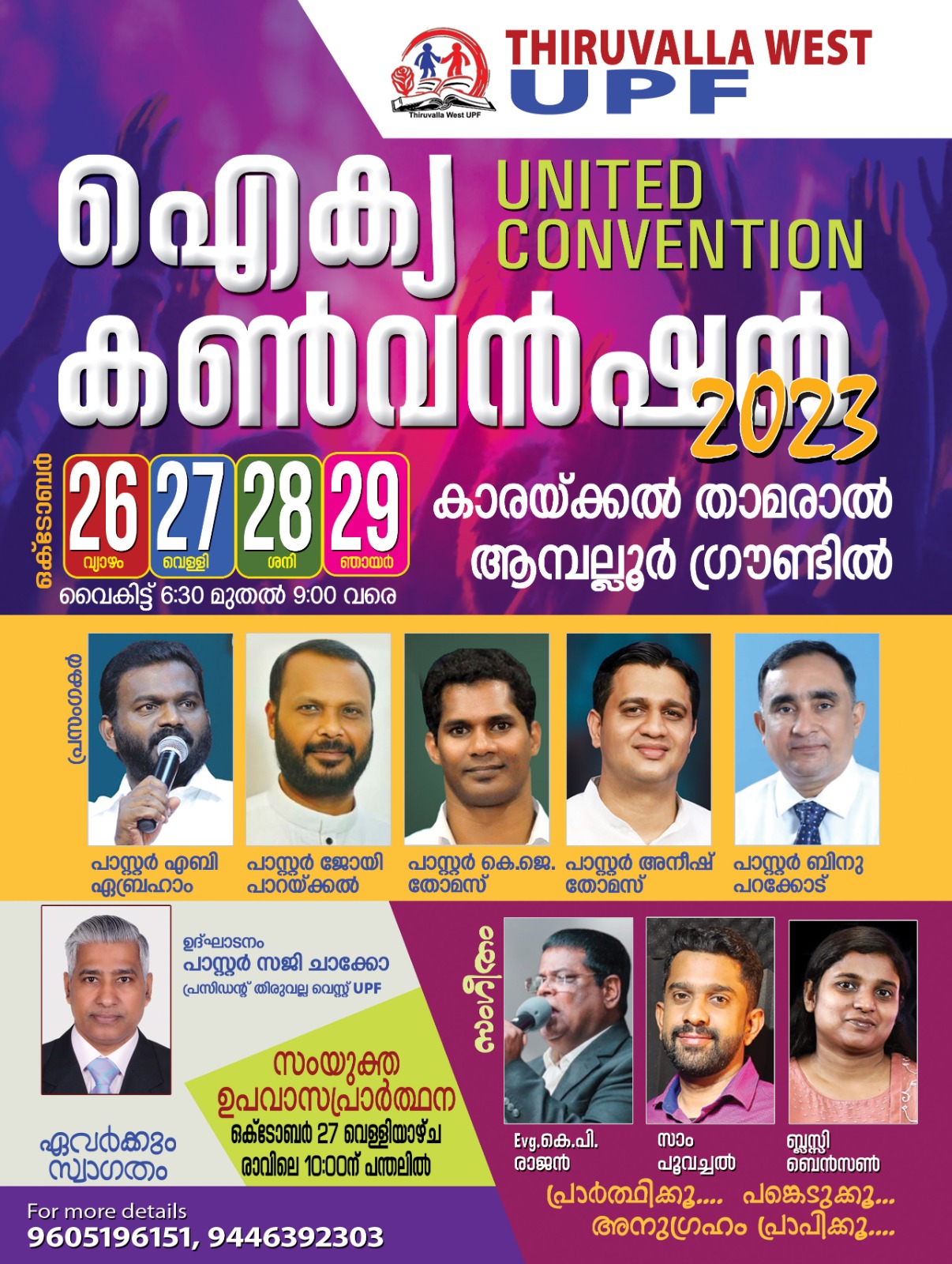 തിരുവല്ല: വെസ്റ്റ് യുപിഎഫ് ഐക്യ കൺവൻഷനും സംഗീത വിരുന്നും 26 വ്യാഴം മുതൽ 29 ഞായർ വരെ വൈകിട്ട് 6.30ന് കാരയ്ക്കൽ താമരാൽ ആമ്പല്ലൂർ ഗ്രൗണ്ടിൽ നടക്കും. 26ന് 6.30ന് യുപിഎഫ് പ്രസിഡൻ്റ് പാസ്റ്റർ സജി ചാക്കോ ഉദ്ഘാടനം ചെയ്യും. വിവിധ ദിവസങ്ങളിൽ പാസ്റ്റർമാരായ എബി ഏബ്രഹാം, ജോയി പാറയ്ക്കൽ, കെ.ജെ.തോമസ്, അനീഷ് തോമസ്, ബിനു പറക്കോട് എന്നിവർ പ്രസംഗിക്കും. 27 വെള്ളിയാഴ്ച്ച രാവിലെ 10ന് സംയുക്ത ഉപവാസ പ്രാർത്ഥന നടക്കും. കെ.പി.രാജൻ, സാം പൂവച്ചൽ, ബ്ലെസി ബെൻസൺ എന്നിവർ സംഗീതശുശ്രൂഷക്ക് നേതൃത്വം നൽകും.