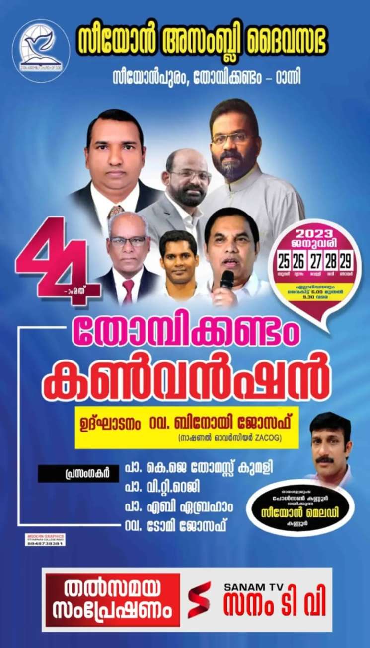 റാന്നി: സീയോൻ അസംബ്ലി ദൈവ സഭയുടെ ആഭിമുഖ്യത്തിൽ 44-ാമത് തോമ്പിക്കണ്ടം കൺവൻഷൻ ജനുവരി 25 മുതൽ 29 വരെ നടക്കും. സഭാ ഓവർസീയർ പാസ്റ്റർ ബിനോയി ജോസഫ് ഉദ്ഘാടനം ചെയ്യും. പാസ്റ്റർമാരായ കെ.ജെ. തോമസ് (കുമളി), വി.റ്റി. റെജിമോൻ, എബി ഏബ്രഹാം, ടോമി ജോസഫ് എന്നിവർ പ്രസംഗിക്കും. പോൾസൺ കണ്ണൂരിന്റെ നേതൃത്വത്തിൽ ‘സീയോൻ മെലഡി’ ടീം ഗാനശുശ്രൂഷ നയിക്കും. സനം ടി.വി. യോഗങ്ങൾ തത്സമയം സംപ്രേഷണം ചെയ്യും.